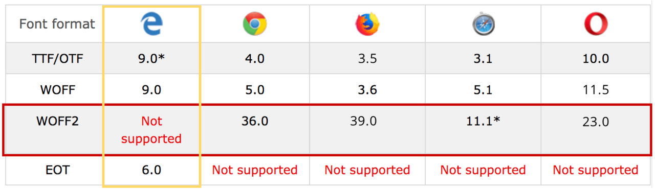 - woff2는 IE를 제외한 모든 브라우저에서 사용할 수 있다.