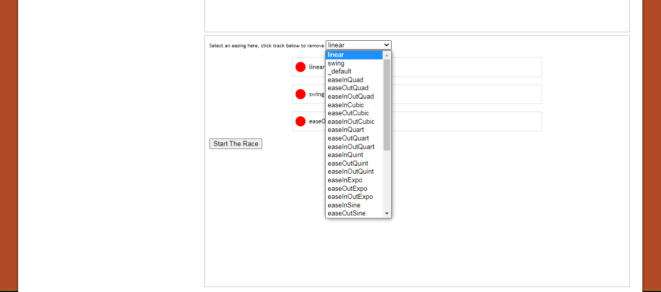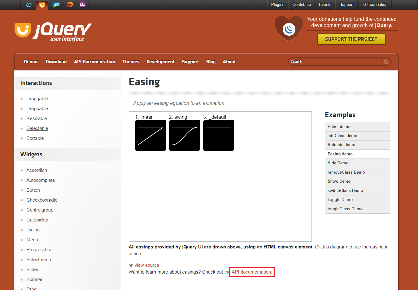 Easings Easing functions specify the speed at which an animation progresses at different points within the animation. jQuery core ships with two easings: linear, which progresses at a constant pace throughout the animation, and swing (jQuery core's default