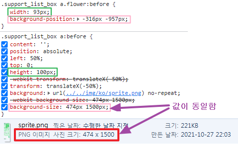 - background-size는 이미지의 크기와 동일하게 설정한다.