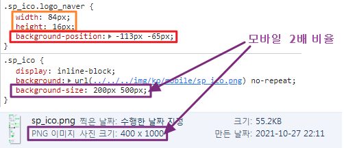 모바일 레티나 디스플레이는 해상도가 2배이기 때문에 (원본 이미지 크기 / 2)를 해서 background-size를 설정한다.
