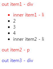 *out item1 - div는 <body>의 첫번째 자식이고, inner item1 - li는 <ul>의 첫번째 자식이다.