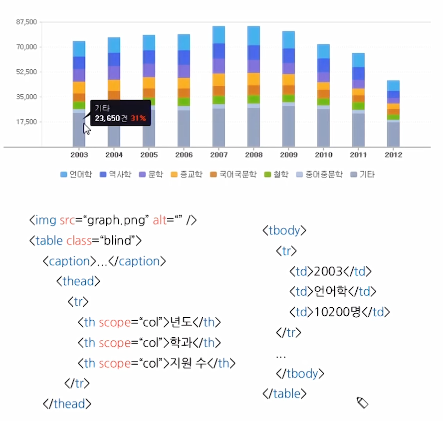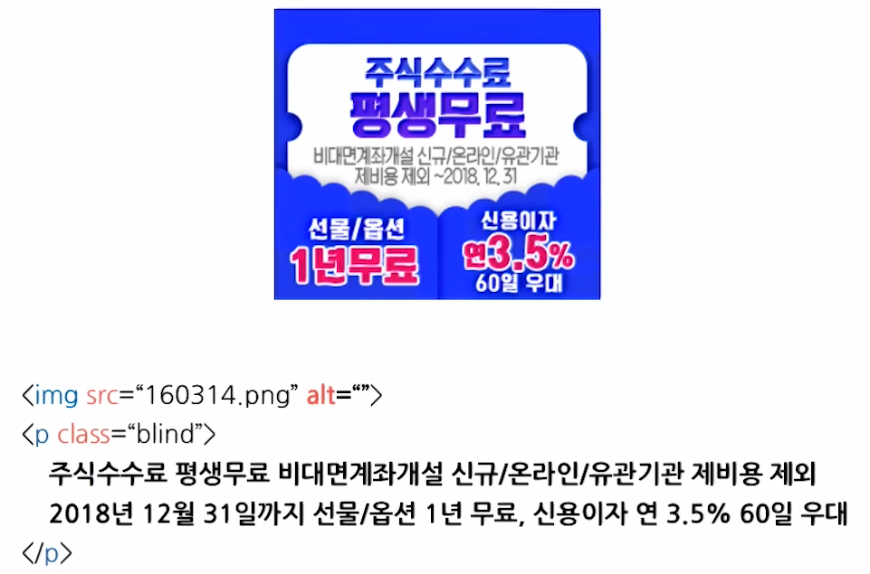 의미있는 이미지(특수문자, 기호 포함), 조직도, 차트, 복잡한 콘텐츠의 경우 숨김 처리로 대체 텍스트를 제공한다.