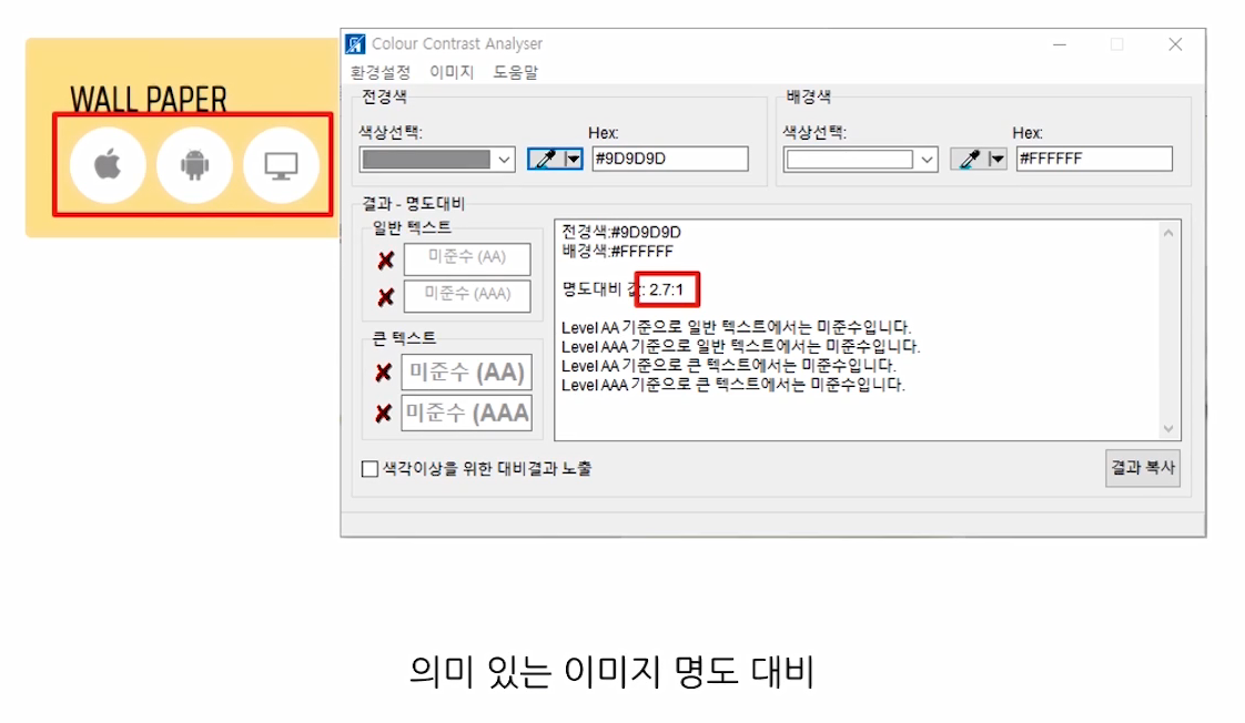 텍스트뿐만 아니라 의미 있는 이미지의 경우에도 이미지를 인식할 수 있도록 명도 대비를 준수해야 합니다.