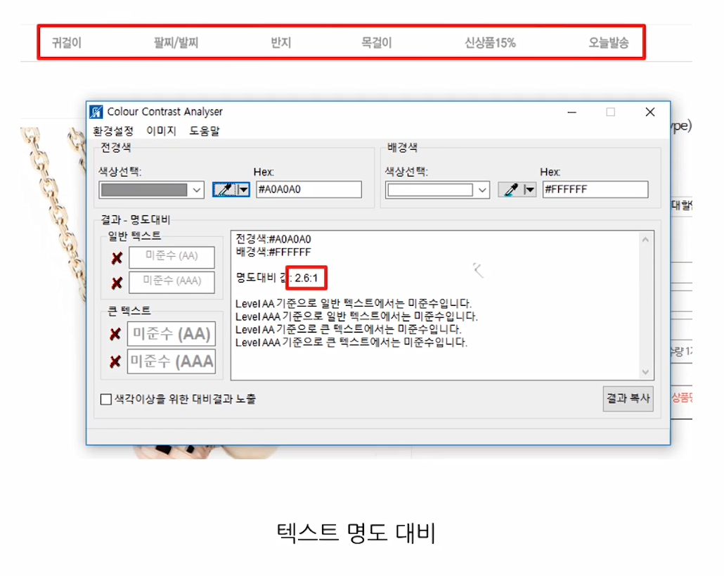 페이지에 존재하는 모든 텍스트에 대해 명도 대비를 준수해야 하는 것은 물론이고, 텍스트가 이미지로 된 경우에도 명도 대비를 준수해야 합니다.