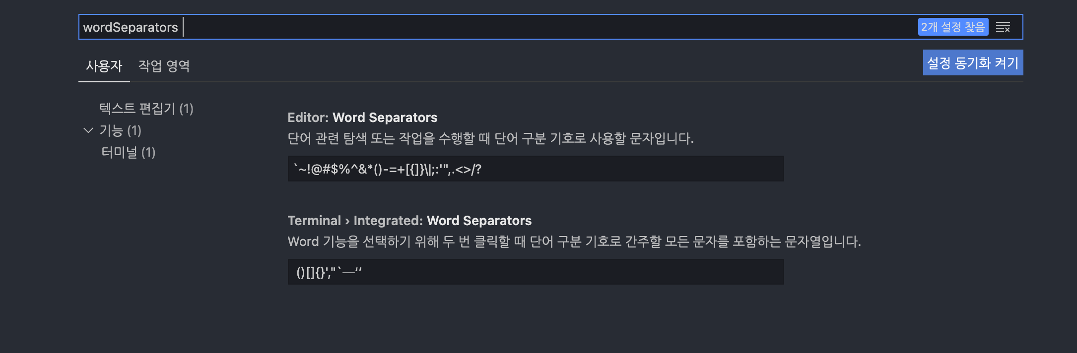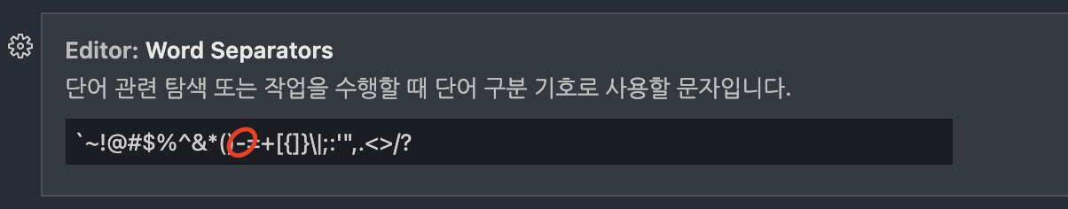 2. 설정 검색창에 "wordSeparators"라고 입력한다.