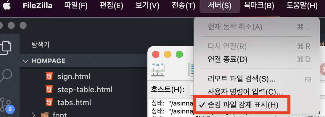 상단바 > 서버 > 숨김 파일 강제 표시 체크